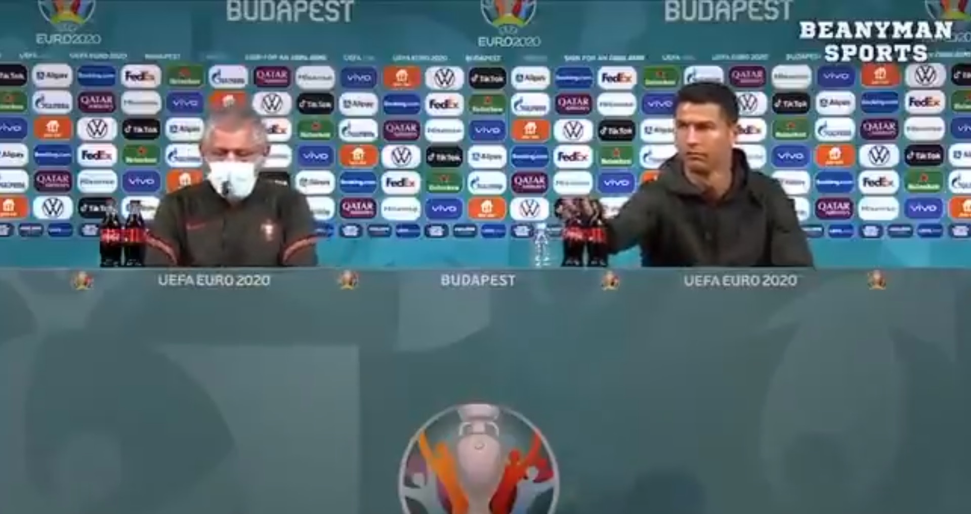 葡萄牙球星c朗拿度 (cristiano ronaldo) 周二出席赛前记者会时,一坐下移走眼前两支赞助商可口可乐汽水,更加拿起樽装水,呼唤大众多加喝水,因而引起网民热论。 据悉,c朗这番的举动,令可口可乐公司市值一度蒸发40亿美元 (约310亿港元)。